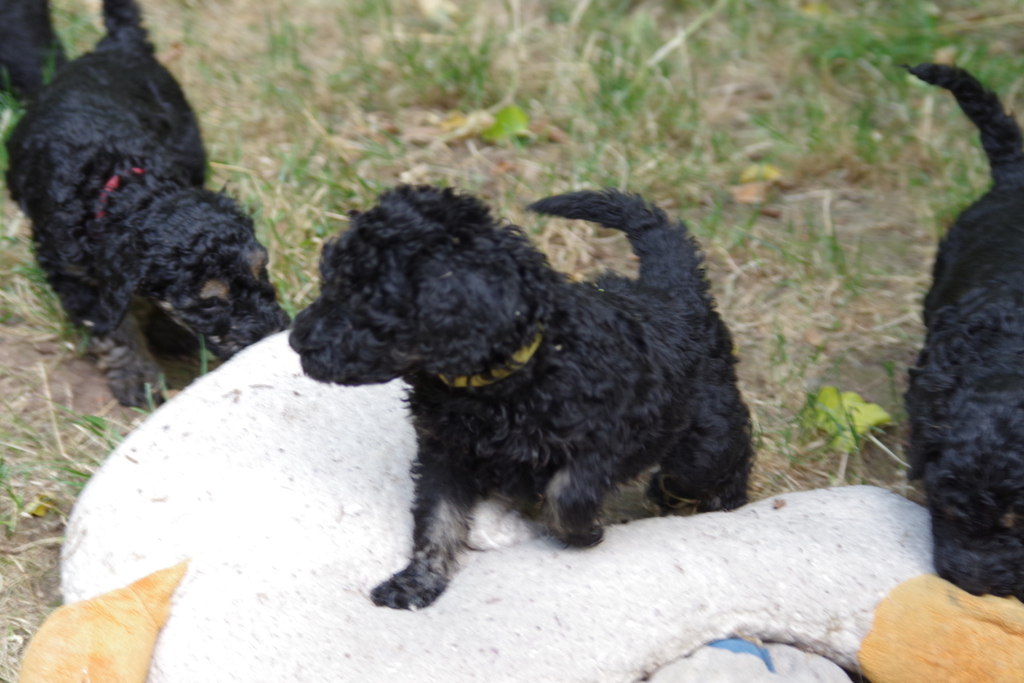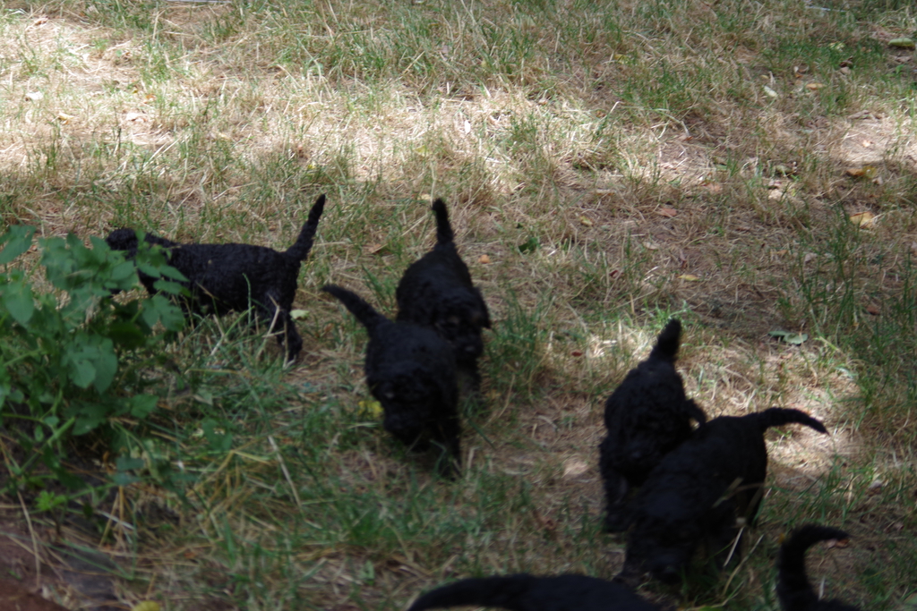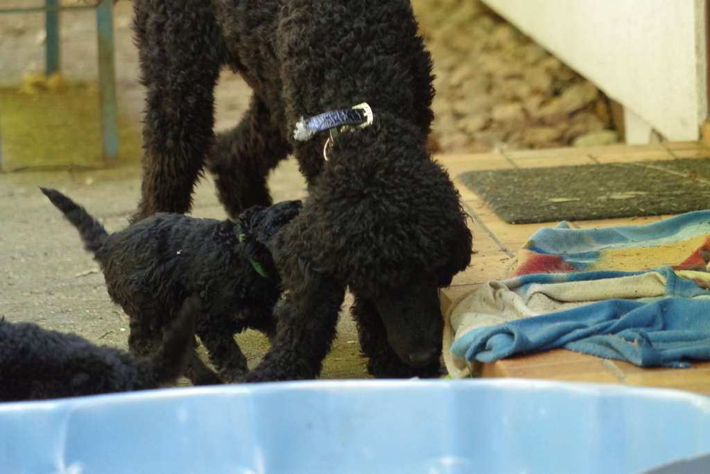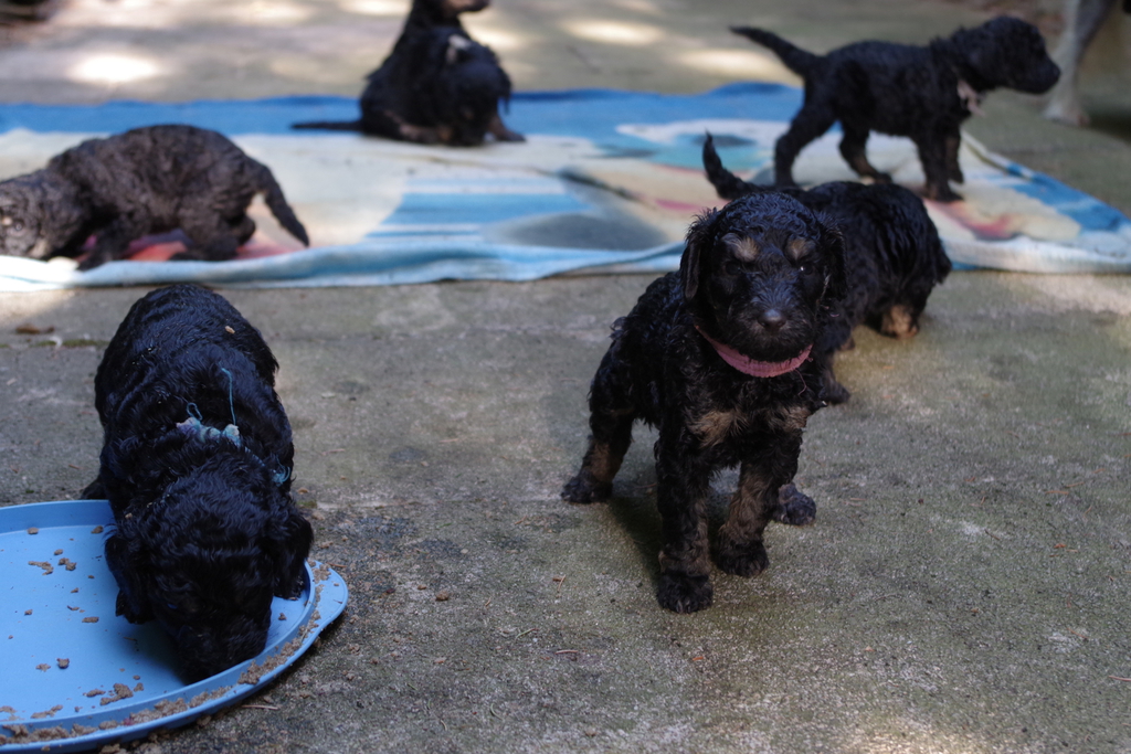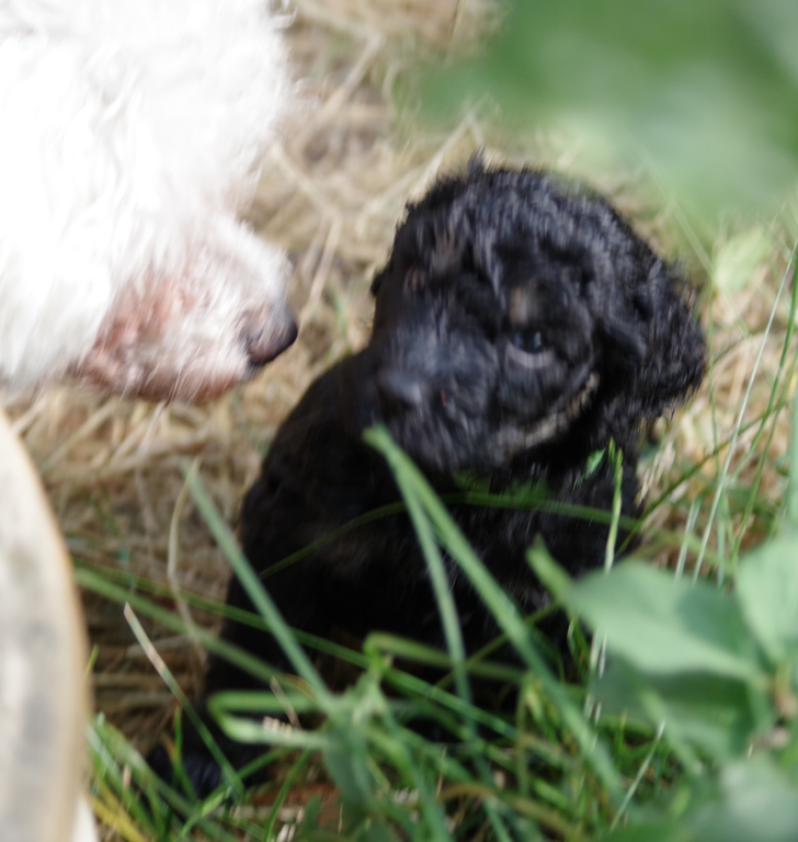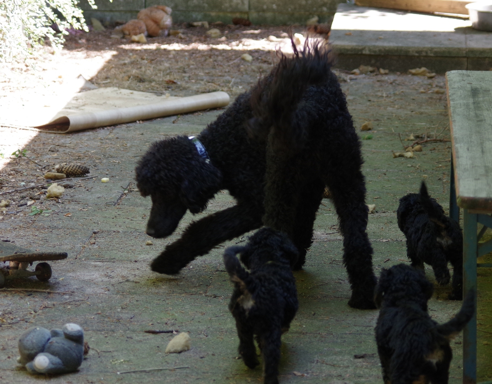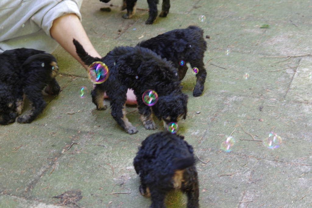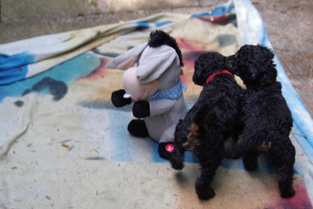 die 4 Wochen alten Welpen erkunden den singenden Esel :))