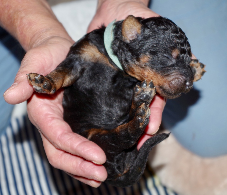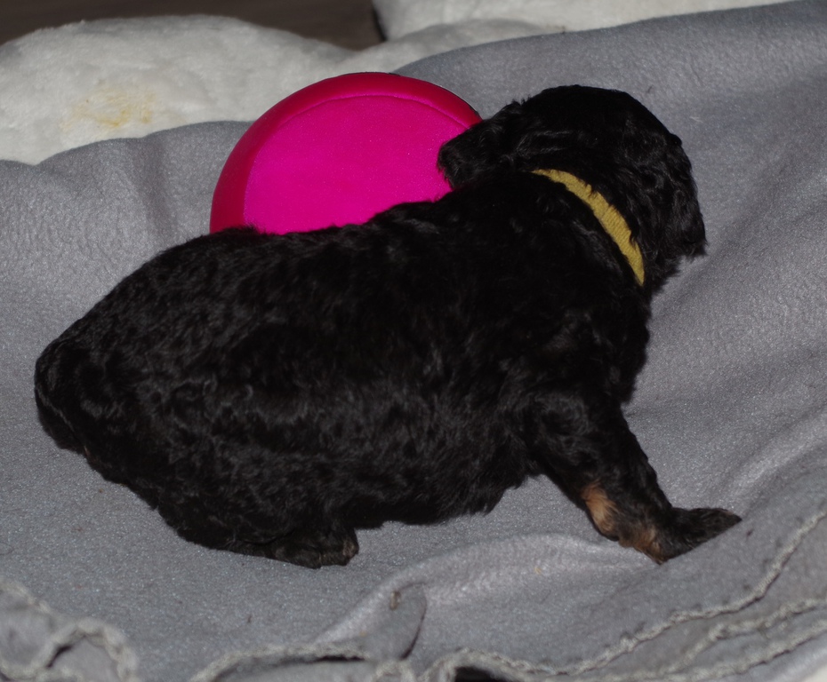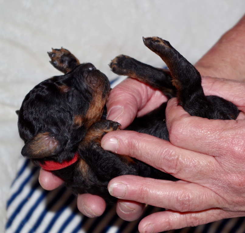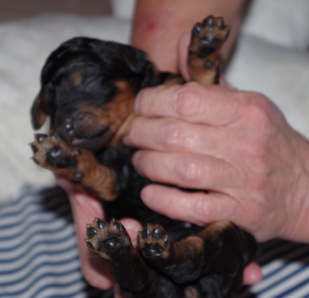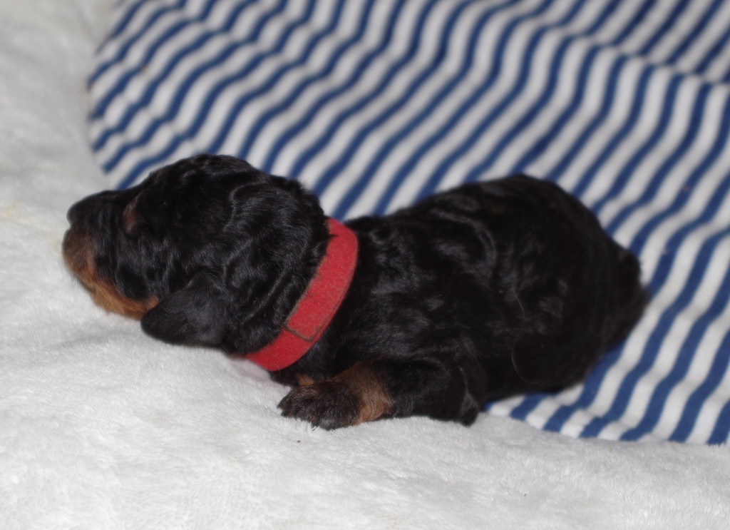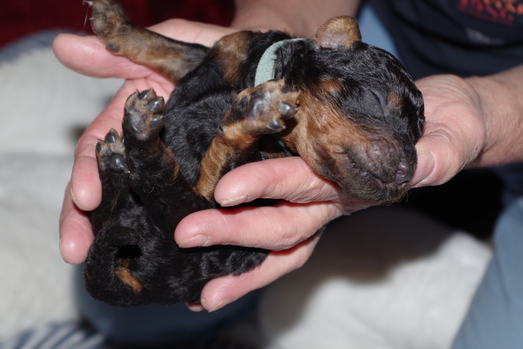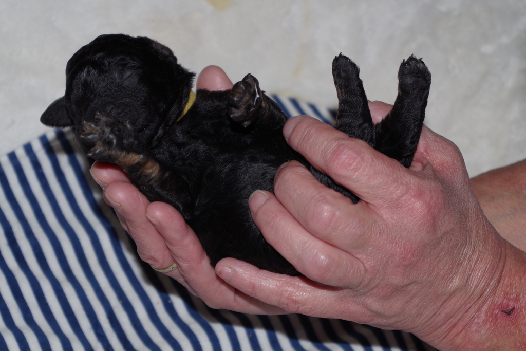 Hündin- gelbes Band (fast schwarz, etwas loh an Vorderpfoten und unter der Rute)