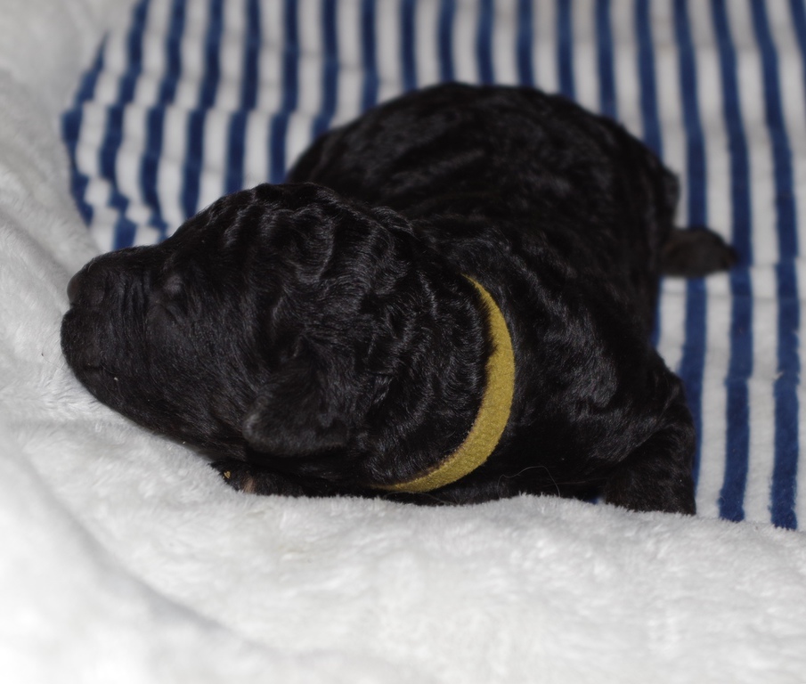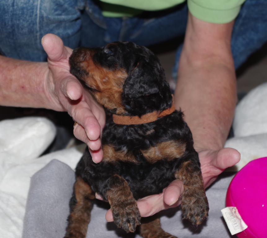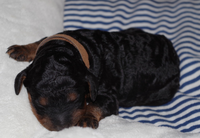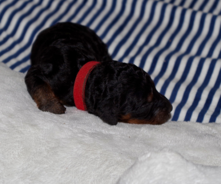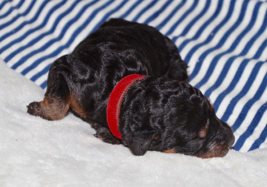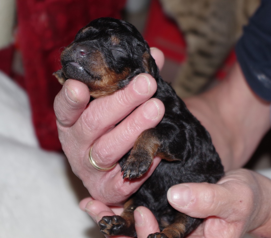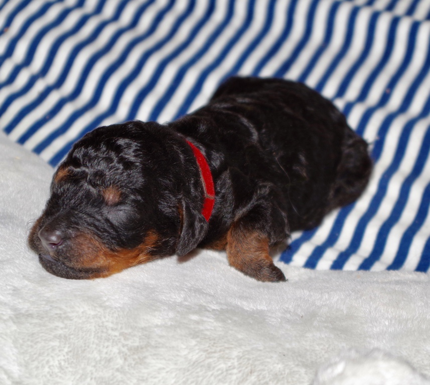 Hündin- gelbes Band (fast schwarz, etwas loh an Vorderpfoten und unter der Rute)